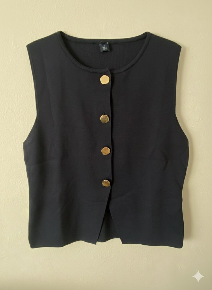 Düğmeli önü ve kolsuz tasarımıyla siyah yelek, normal kesim ve ipeksi dokusuyla ofis için uygundur.