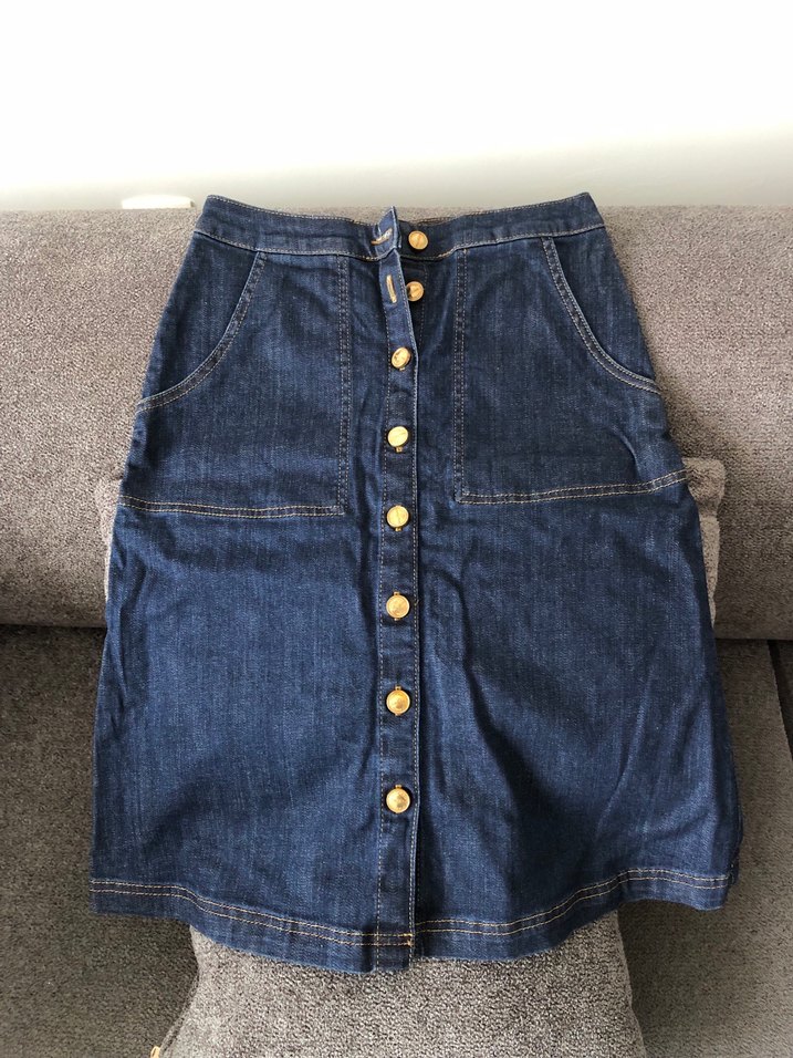 Düğmeli ön kısmı ve dar kesimiyle lacivert kot etek, günlük kullanıma uygun rahat bir tarza sahiptir. Kusuru yoktur.