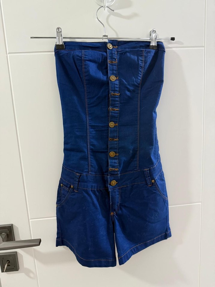 Düğmeli, lacivert kot kumaştan yapılmış, straplez ve kısa kesim olan, dar kesim tulum. Kolsuz ve günlük sokak stili için uygundur.