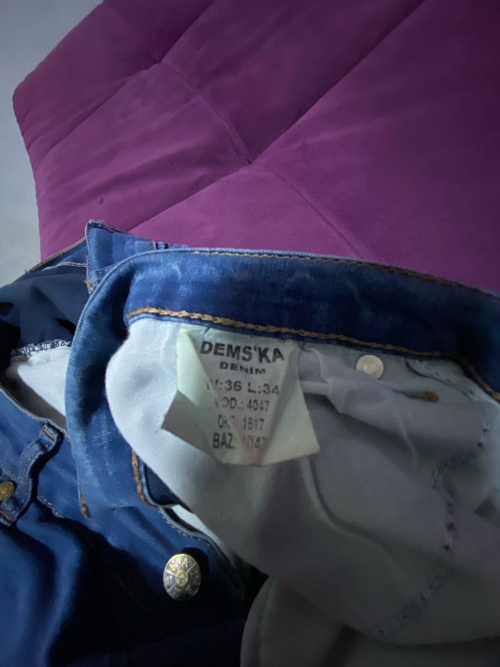 Düğmeli, koyu mavi renkli, baskılı denim pantolon. Midi boyda ve dar kesim, rahat günlük sokak stili için uygun. Marka: DEMS'KA.