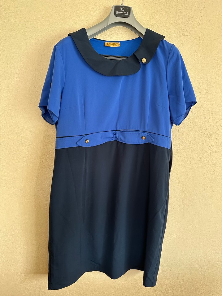 Düğmeli, yakalı ve kısa kollu kadın elbisesi, midi boyda ve regular fit. Lacivert ve mavi tonları, hafif desenli, ofis ve günlük kullanım için uygun.
