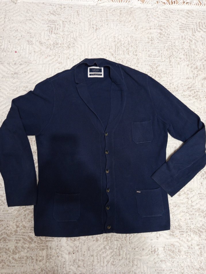 Düğmeli, lacivert renk midi uzunlukta hırka. Notlu yaka ve uzun kollu, yumuşak ve sıcak kumaştan üretilmiştir. Ofis için uygundur.