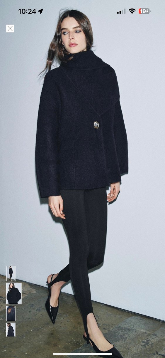 Düğmeli önü, kesik yaka ve uzun kollu lacivert kaban. Rahat, normal boyda ve yumuşak, sıcak kumaştan üretilmiştir, ofis için uygundur.