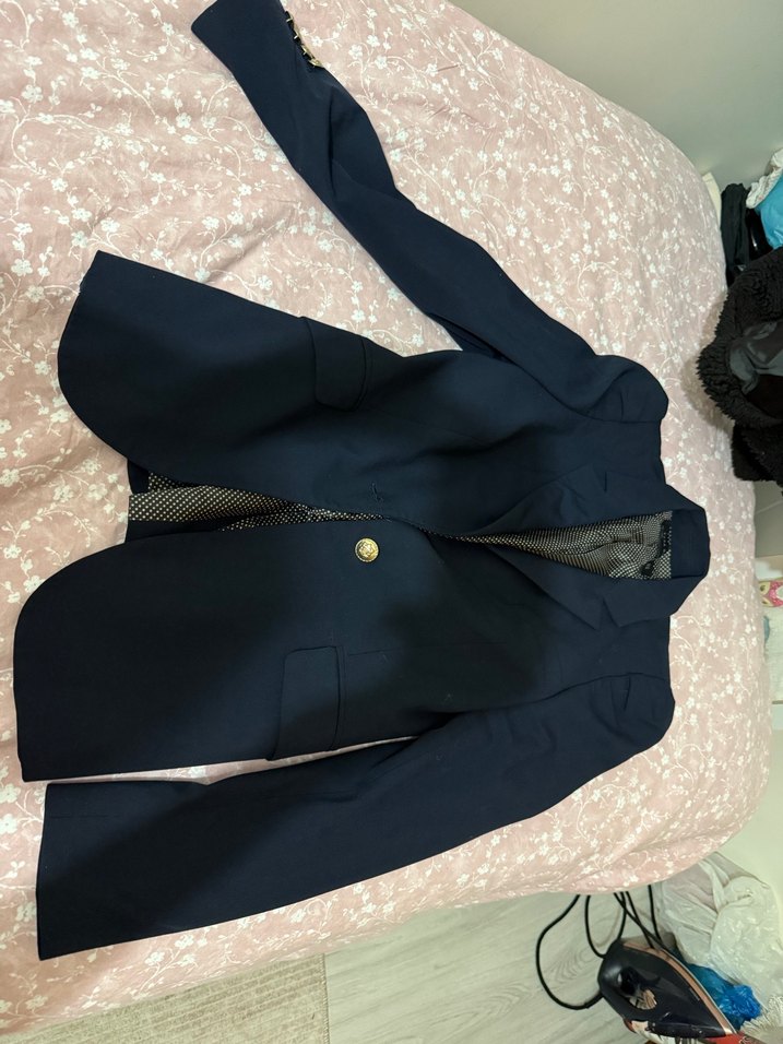 Düğmeli, notched lapel yakalı lacivert kadın ceket. Uzun kollu, midi boy ve normal kesim. Ofis için uygun, klasik ve sade tarzda, sentetik kumaştan yapılmıştır.