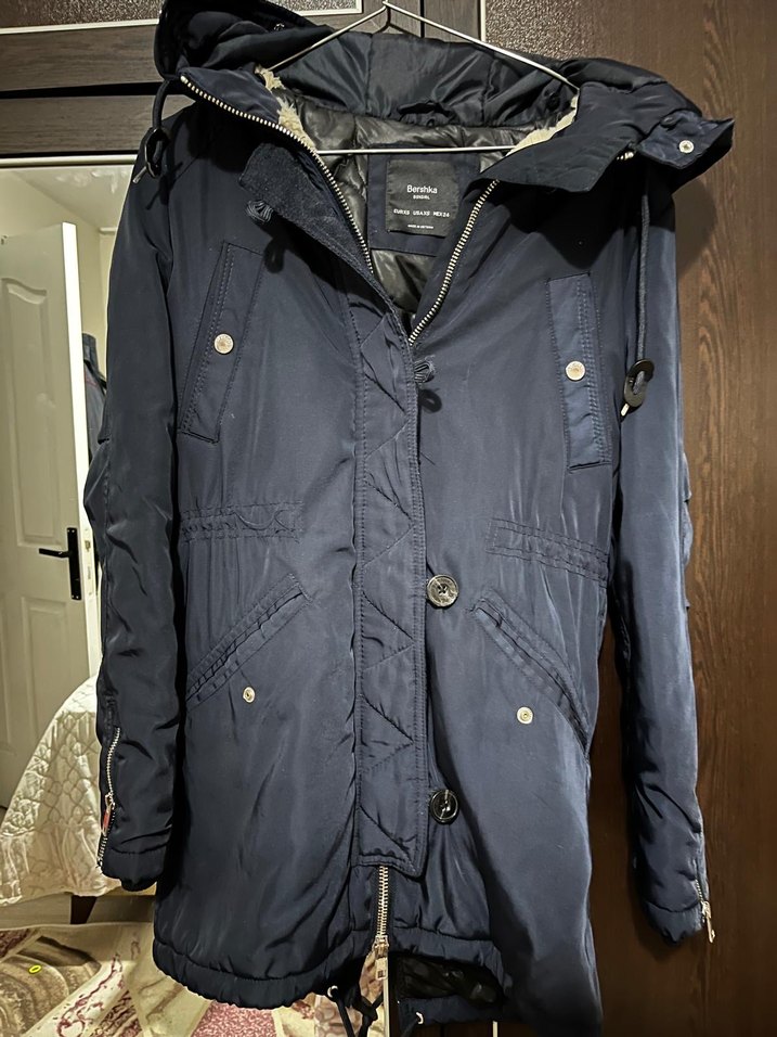 Düğmeli, lacivert renkli, notlu yaka ve uzun kollu, sentetik kumaştan yapılmış, günlük kullanıma uygun, midi uzunlukta ve dar kesim kadın ceket.