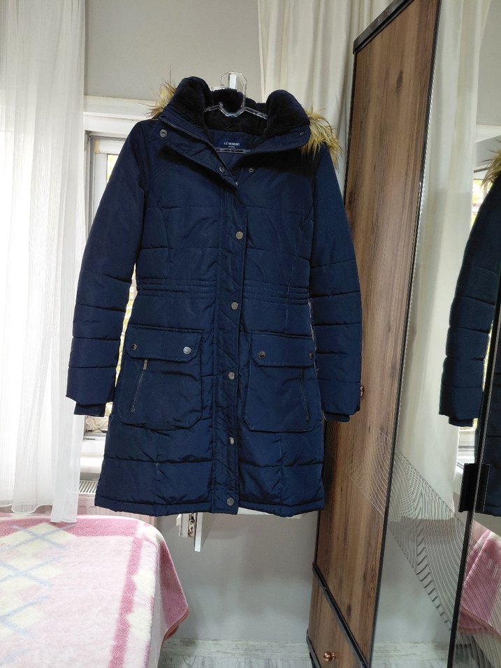 Düğmeli ön kısmı ve kesimli yakası olan, yumuşak ve sıcak kumaştan yapılı lacivert, rahat kesim sokak stili monttur. ÖLÇÜLERİ::OMUZDAN BOY:::82 cm. İKİ KOLTUK ARASI::50 cm.