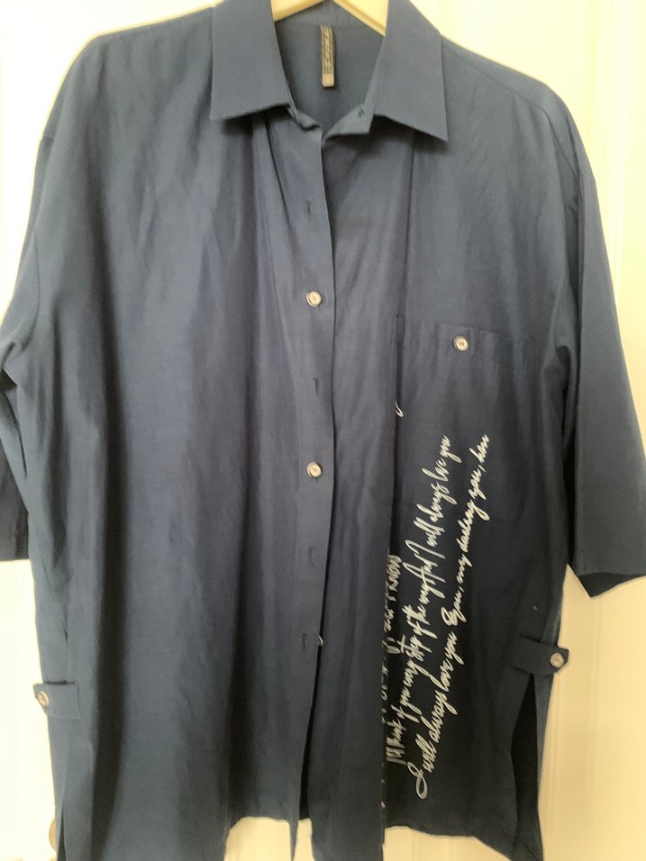 Lacivert keten kumaştan, kısa kollu ve notlu yaka detaylı, düğmeli, bol kesim midi kadın gömlek. Yanında baskı deseni bulunur, günlük kullanım için uygundur.