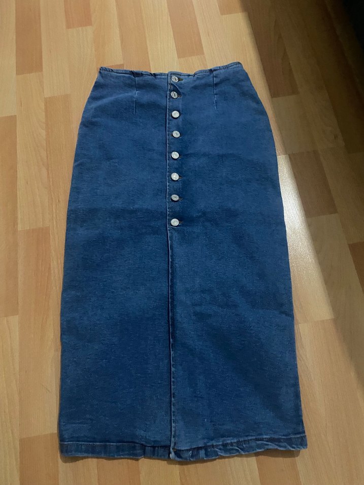 Düğmeli Lacivert Midi Kot Etek