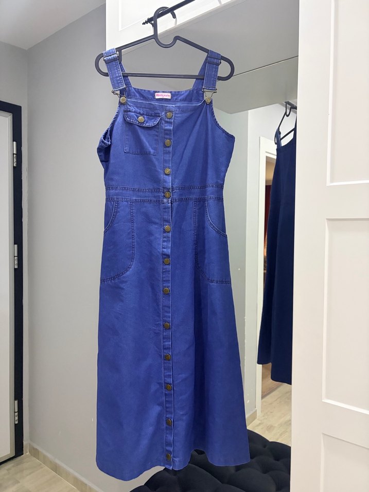 42 beden ama dar kalıp. Düğmeli ve askılıksız tasarıma sahip lacivert kot midi salopet, günlük kullanım için rahat ve normcore tarzda, normal kesimdir.