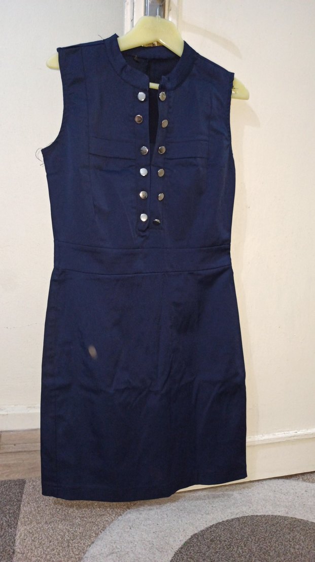 Düğmeli, kolsuz, notched lapel yakalı lacivert midi elbise. Parlak sentetik kumaştan, ofis için uygun, regular fit.