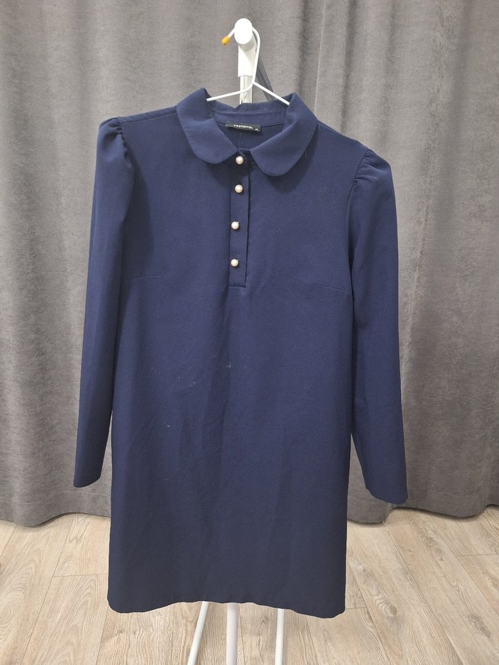 Lacivert renkli, yakalı ve düğmeli önü olan midi örme elbise. Uzun kollu ve regular kesimdir, rahat ve sıcak kumaştan üretilmiştir.