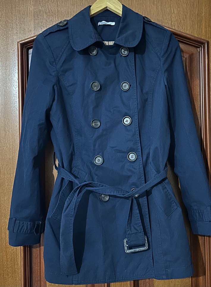 Düğmeli ve kuşaklı, normal boy lacivert midi trençkot. Notch yaka ve kayışlı kollara sahip, iş ortamına uygun şık bir tasarım. Boyu 70 cm omuz 40 cm göğüs 48 cm kol boyu 60 cm