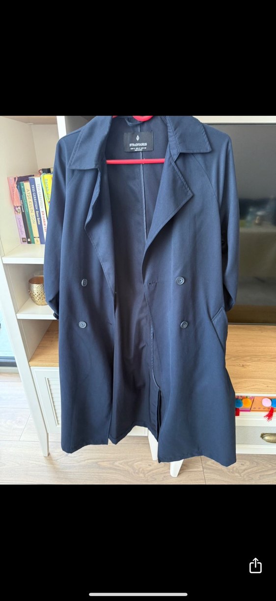 Düğmeli, notched lapel yakalı lacivert midi trençkot. Uzun kollu ve normal kesim, iş ve günlük kullanıma uygundur. ️