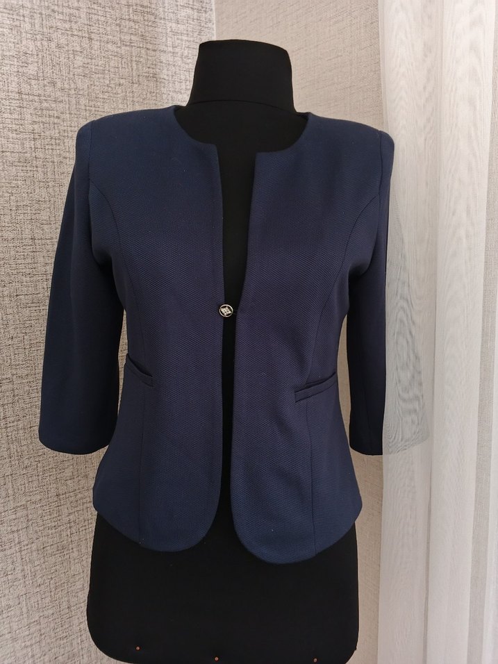Lacivert renkli, düğmeli mini kadın blazer. Uzun kollu, kısa boylu ve sentetik kumaştan üretilmiştir. Ofis için şık ve modern bir tasarım sunar. ✨