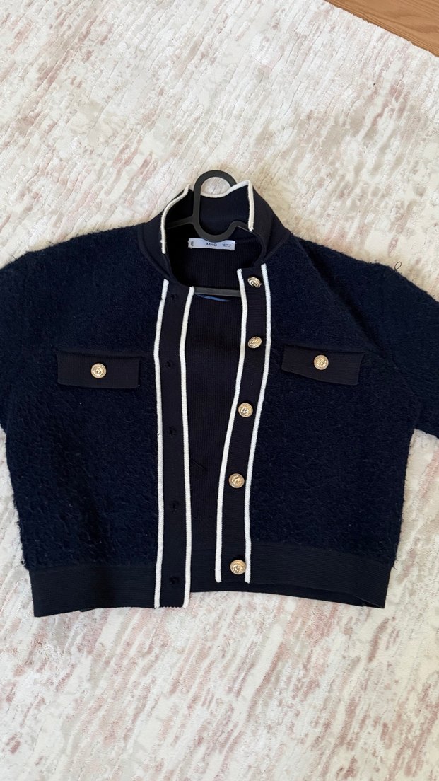 Lacivert ceket, uzun kollu ve sarı düğmeli. Yumuşak ve sıcak kumaştan, günlük şık sokak tarzına uygun. Aşırı kalın sıcak tutuyor
