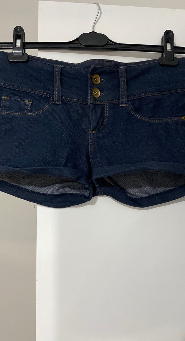 Düğmeli ön kısmı ve kısa boyu ile lacivert renkli, dar kesim kadın denim şort. Rahat dış mekan kullanımı için uygundur.