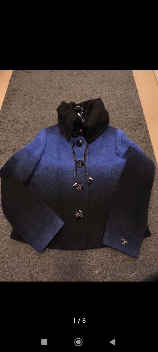 Bu kadın kabanı, düğmeli ön kısmı ve kesimli yaka detayı ile yumuşak ve sıcak kumaştan üretilmiştir. Uzun kollu, koyu mavi batik desene sahiptir. 42 beden ama biraz dar kalıp 38/40 uyumlu.