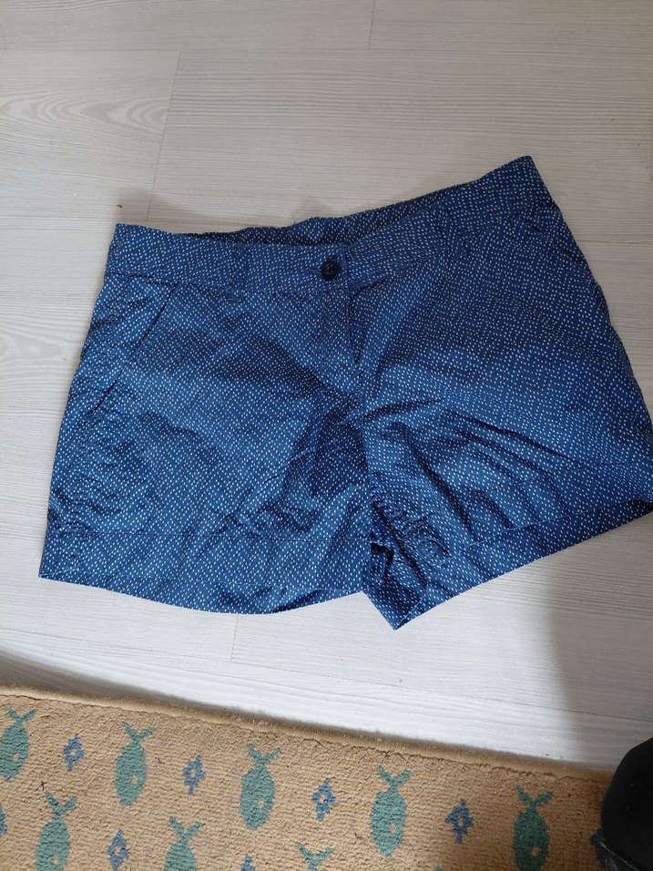 Düğmeli, sentetik kumaştan yapılmış, lacivert renkli, dar kesim kadın mini şort. Sokak stili ve açık hava kullanımı için uygun.