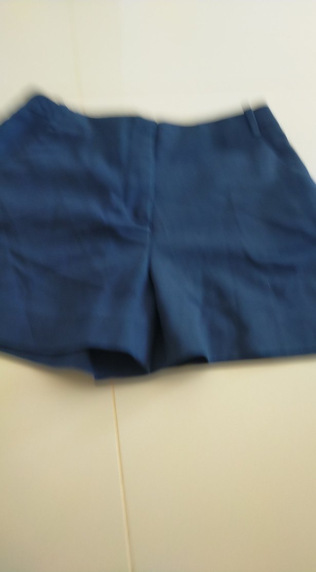 Düğmeli, lacivert renkte, sentetik kumaştan yapılmış, bol kesim kısa şortu.