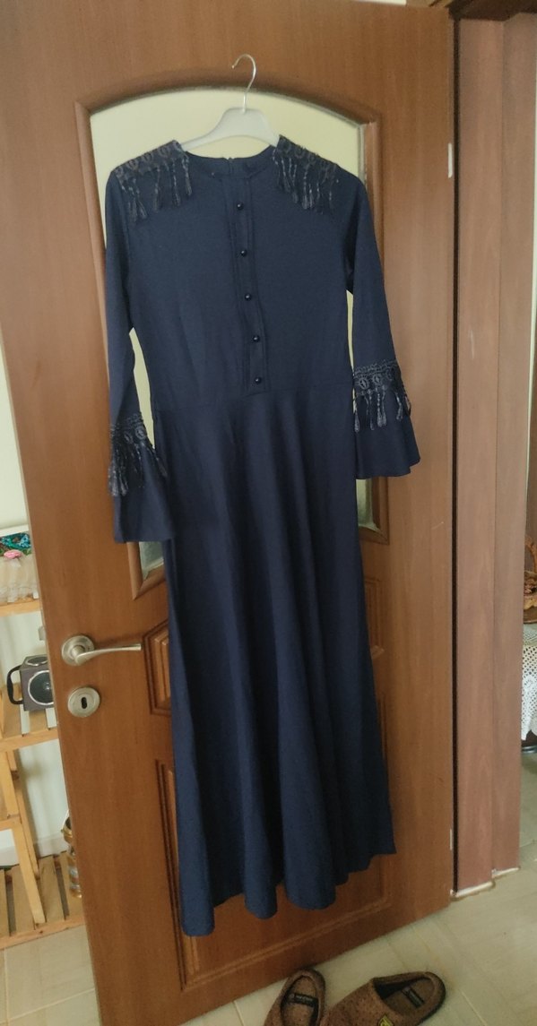 Uzun kollu, düğmeli ve yakası açık lacivert elbise, nakış detaylarıyla bohem ve mütevazı tarzı birleştirir.