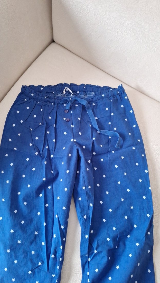 Düğmeli, yıldız desenli lacivert pamuk pantolon. Rahat kesimi ve midi boyuyla günlük kullanıma uygundur.