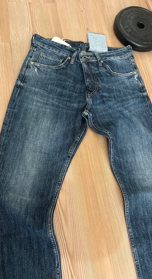 Düğmeli, normal boy lacivert erkek denim pantolon, günlük kullanıma uygun, desen içermeyen rahat kesim.
