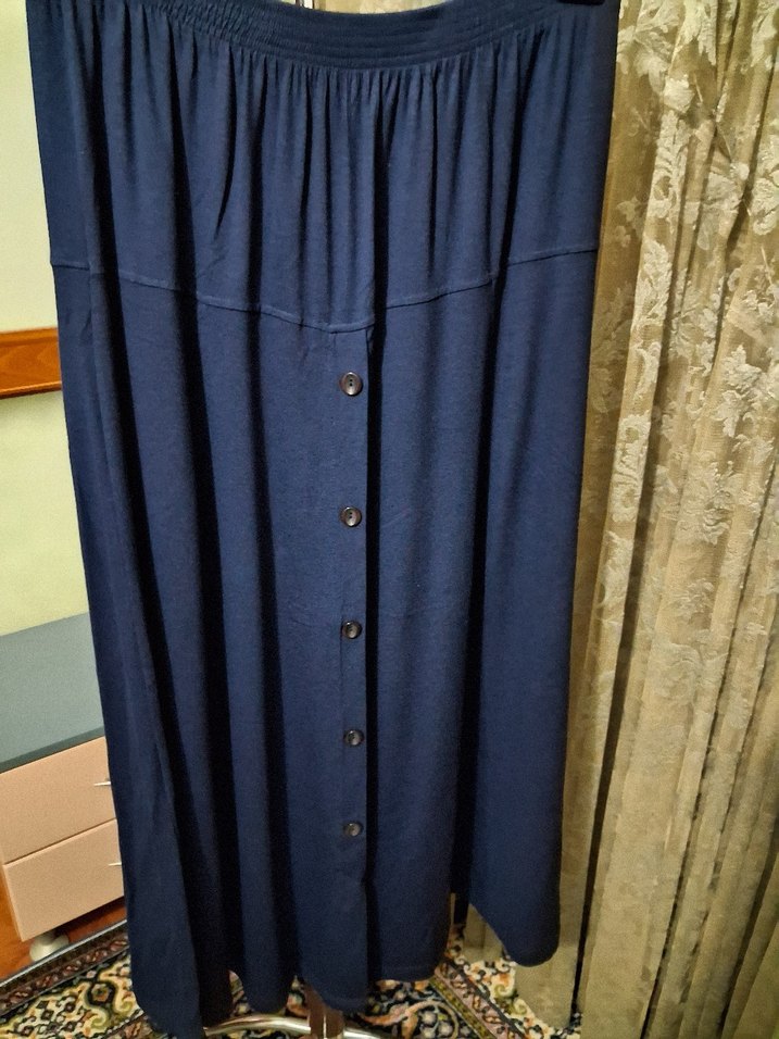 Kapalı düğmeli ve bol kesim, lacivert, uzun penye etek, günlük kullanım için uygun. 4 B. Seçil marka,