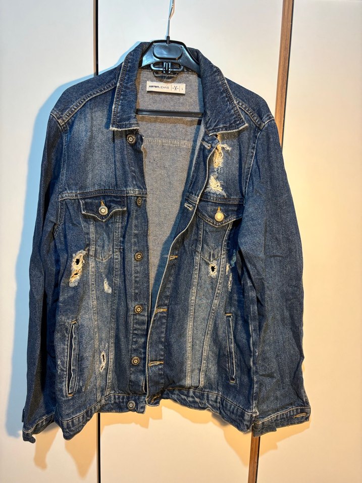 Düğmeli, uzun kollu, salaş kesim lacivert denim ceket. Notlu yaka ve desensiz, günlük kullanıma uygun rahat stil sunar.