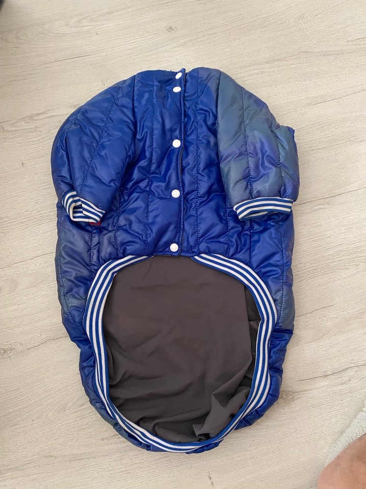 Düğmeli ön kısmı ve çizgili manşetleriyle lacivert köpek montu, sokak stili ve rahat bir tasarım sunar.
