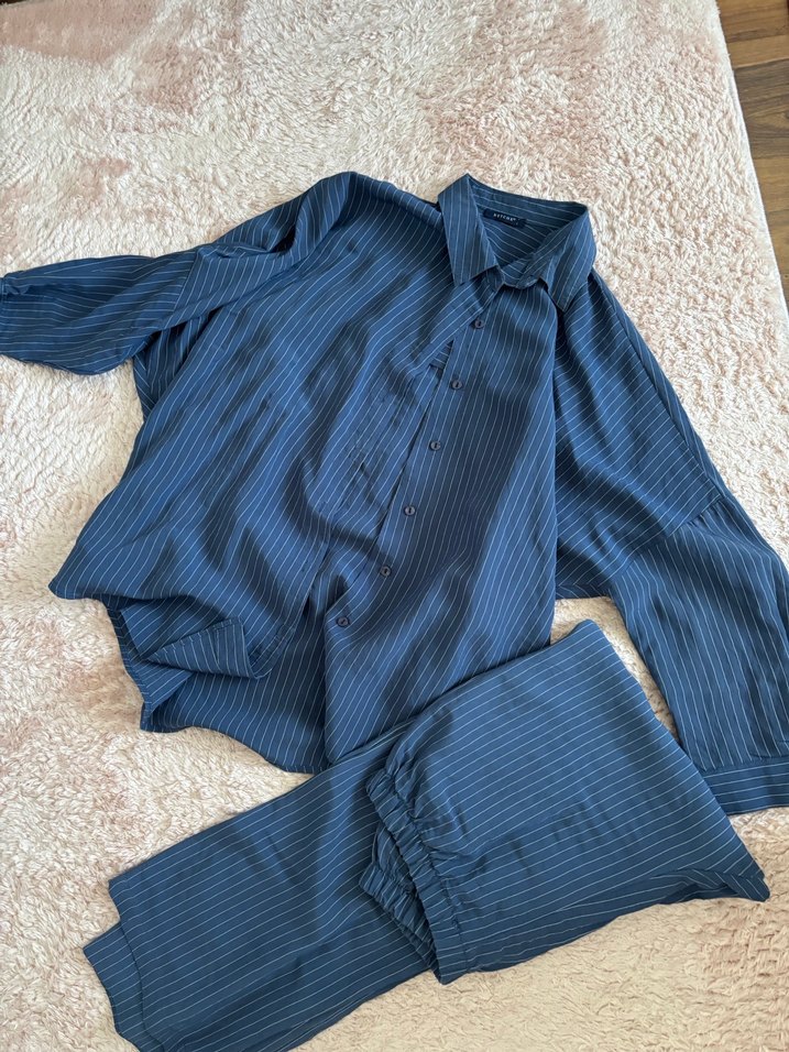 Lacivert, çizgili ve düğmeli takım bol kesim ve uzun kolludur. Rahat ve şık bir görünüm sunar.