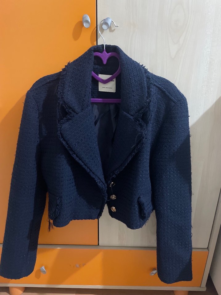 Sıfır ürün etiketi yok sadece düğmeli ve desenli şık lacivert crop ceket. Hiç giyilmedi. Tiffany tomato xl beden. Genis kalip