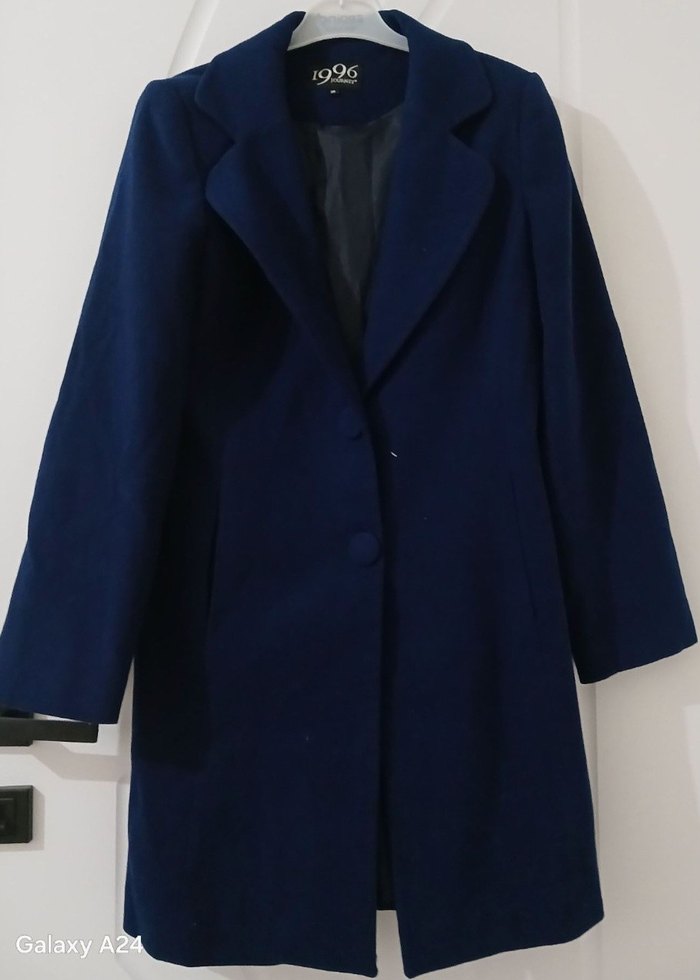 Düğmeli önü ve geniş yakasıyla, yumuşak ve sıcak kumaştan uzun kollu, lacivert renkte klasik kesim kadın kaban.