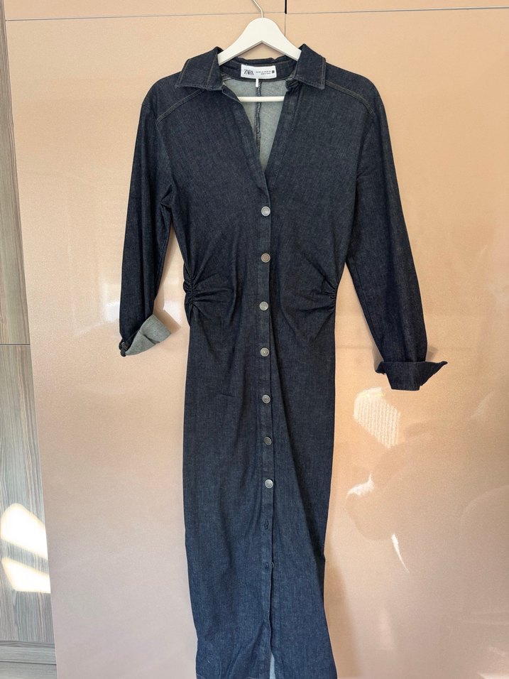 Lacivert denim kumaştan, düğmeli ve uzun kollu bu elbise, notched lapel yaka ve regular fit kesime sahiptir. Günlük kullanım için uygundur.