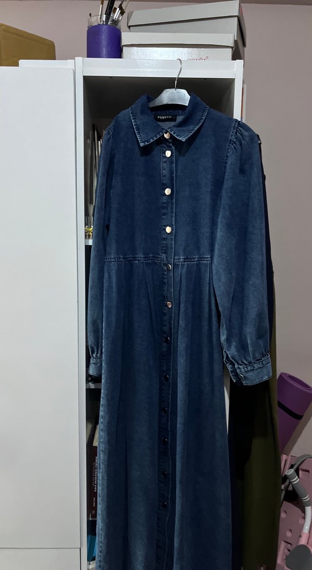 Lacivert uzun denim elbise, düğmeli ön ve uzun kollu. Yaka kısmı notched lapel, bol kesim ve hafif batik desenlidir. Günlük rahat kullanıma uygundur. ÜRÜN TEMİZDİR TRENDYOLDAN ALDIM 2 KEZ GİYDİM