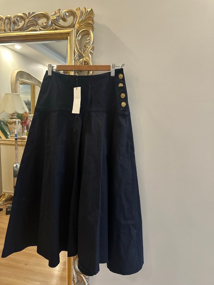 Lacivert uzun denim etek, yan tarafında düğme detayları ve bol kesimiyle normcore stiline uygun. Ofis için şık bir seçenek.