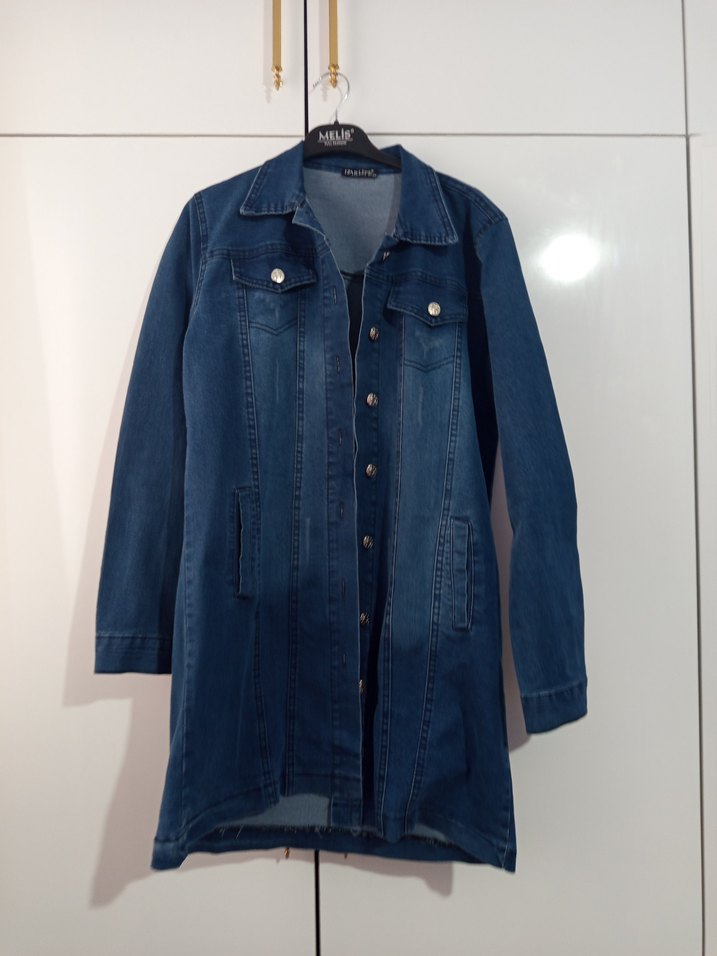 Lacivert uzun boylu denim ceket, düğmeli, yakası kesimli ve uzun kolludur. Rahat kalıplı, günlük sokak tarzı için uygundur. ✨