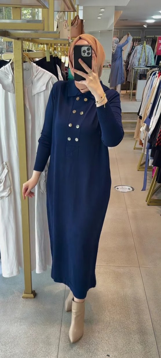 Lacivert uzun elbise, düğmeli ve yüksek yakalıdır. Uzun kollu, regular fit ve sentetik kumaştan üretilmiştir. Günlük ve iş kullanımı için uygundur.