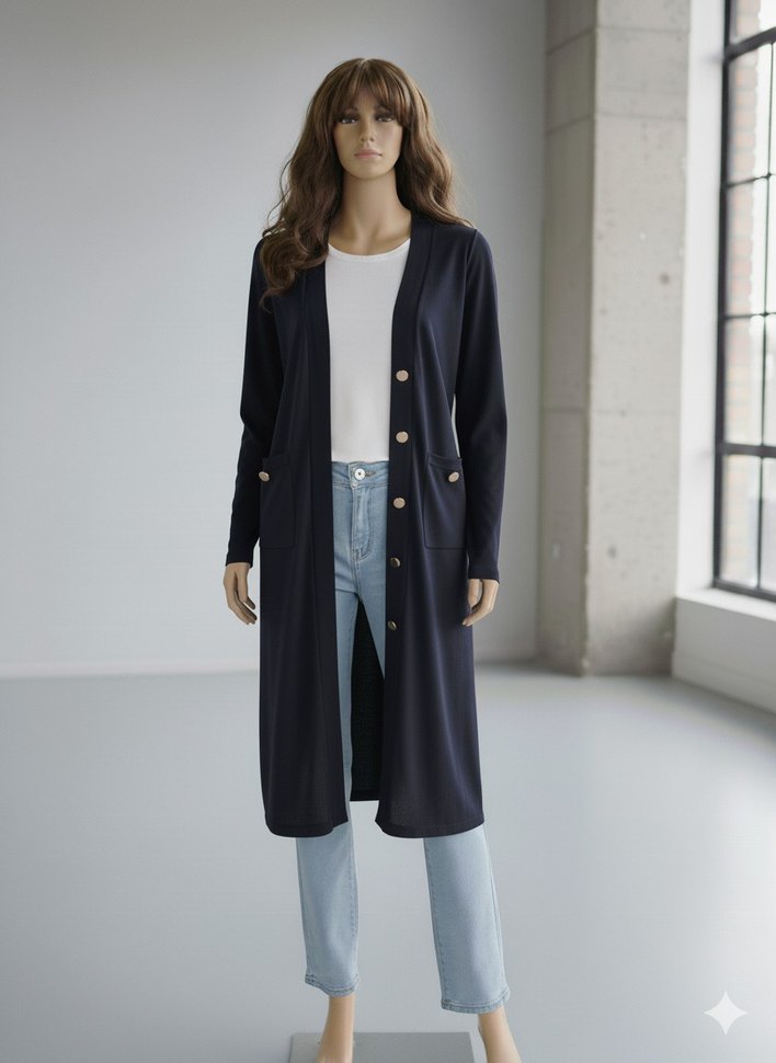 Lacivert uzun hamile ceketi, düğmeli, oturan kesim ve kesik yakaya sahip. Uzun kollu, cepli ve sentetik kumaştan yapılmıştır. Günlük sokak stili için uygundur.