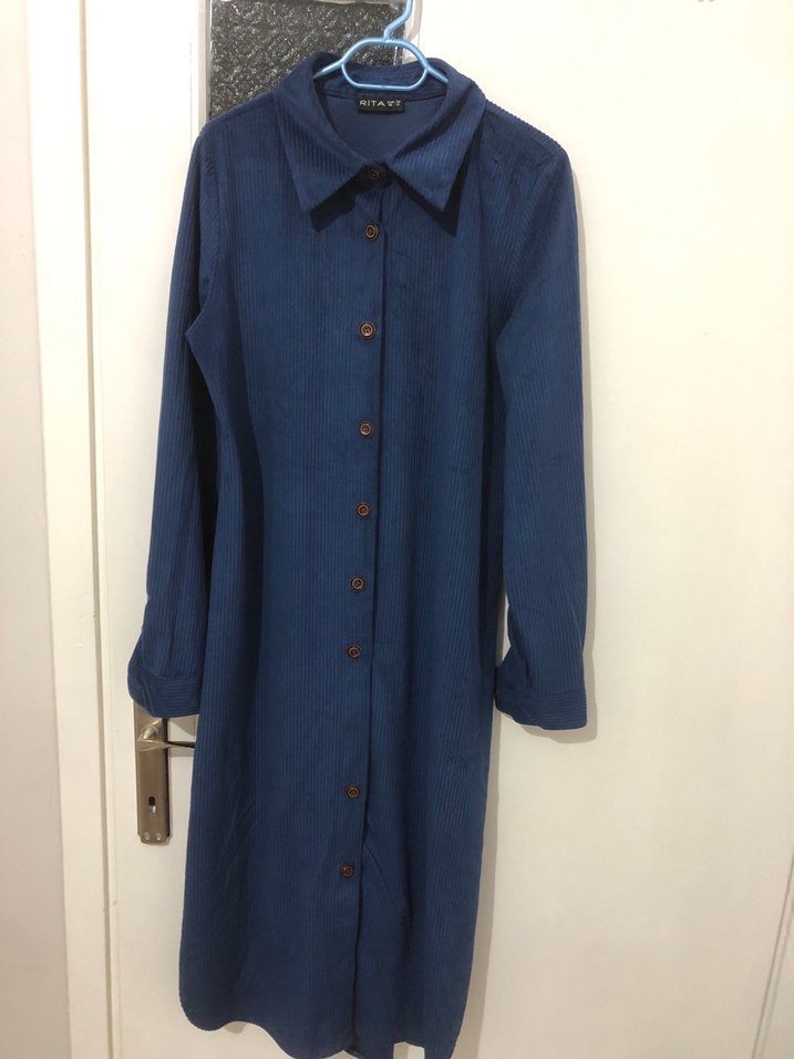 Düğmeli Lacivert Uzun kadife kadın gömlek