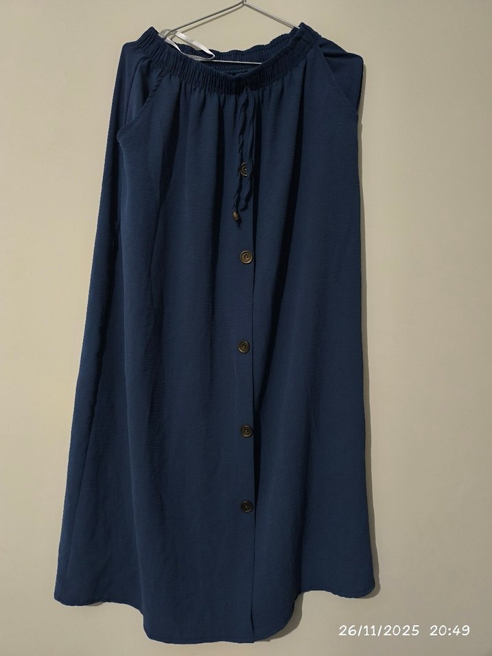 Düğmeli ve lacivert uzun etek, yumuşak sentetik kumaştan üretilmiştir. Minimalist tarzıyla günlük rahat kullanıma uygundur. ayrobin kumaş.