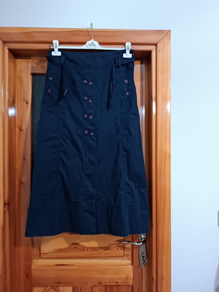 Lacivert uzun etek, düğmeli ve bol kesimdir. Sentetik kumaştan üretilmiş, günlük rahat sokak stili için uygundur.