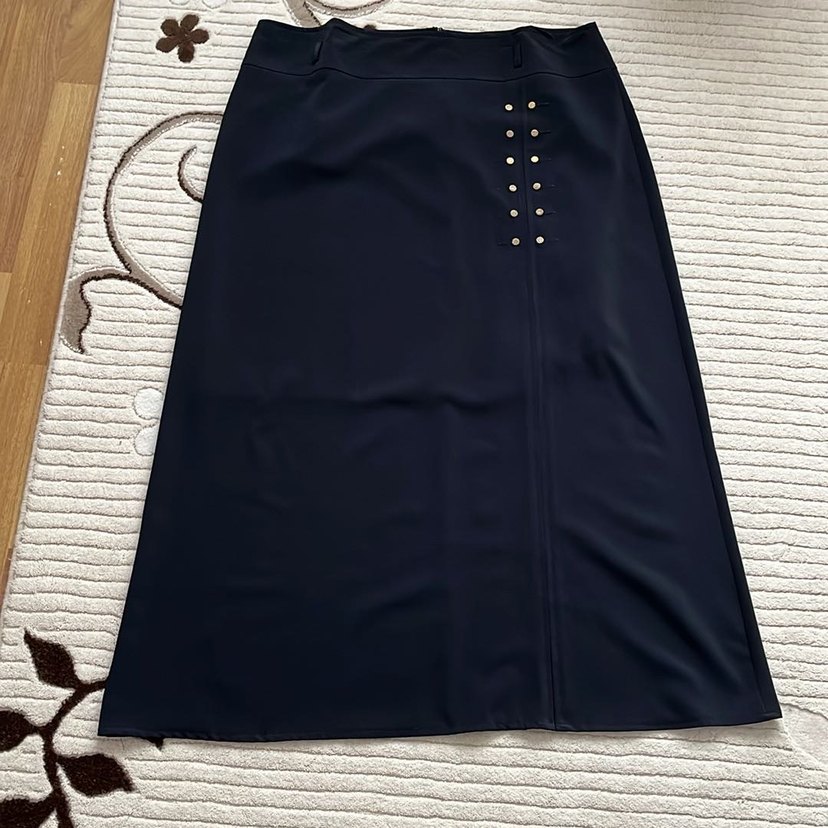 Düğmeli detaylara sahip lacivert uzun etek, düz kesim ve sentetik kumaştan üretilmiştir.