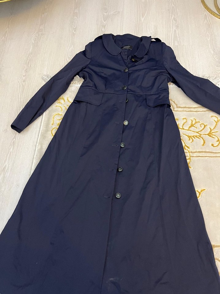 Düğmeli ve yakalı uzun lacivert kaban, sentetik kumaştan üretilmiş, bol kesim ve uzun kolludur. Günlük kullanıma uygundur.