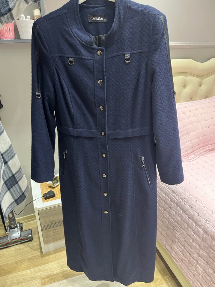 Düğmeli önü ve kesik yaka detaylı, uzun lacivert kadın kaban. Uzun kollu, nakış desenli ve sentetik kumaştan, ofis için uygun klasik şıklıkta. Herhangi bir defosu yoktur, çok iyi durumdadır. 42 bedendir marka temsilidir