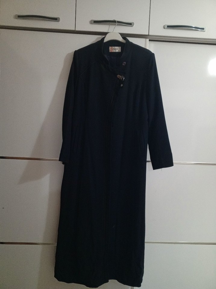 Düğmeli, uzun lacivert kadın kaban. Notlu yakalı, uzun kollu ve rahat kesimdir. Yumuşak ve sıcak kumaştan üretilmiştir, ofis için uygundur.