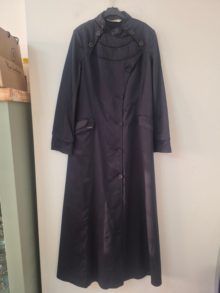 Düğmeli önü ve kesik yaka detayıyla lacivert pardesü boy 142 cm etikette 46 beden yazıyor ama dar kesim olduğu için 40-42-44
