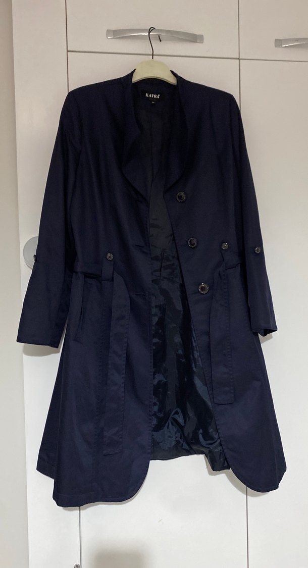 Düğmeli, uzun kesim ve sivri yaka detaylı lacivert trençkot. Uzun kollu ve sentetik kumaştan, ofis için uygun şık bir parça.