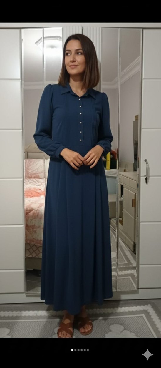 Lacivert uzun tulumu, düğmeli ön, yakalı ve uzun kolludur. Bol kesim ve vintage tarzıyla ofise uygun, sentetik yumuşak kumaştan üretilmiştir.
