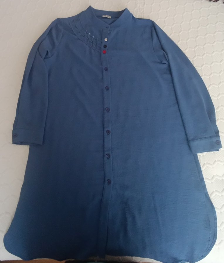 Düğmeli ve yakalı bu kadın tunik, uzun boy ve kısa kollu. Yumuşak pamuk kumaştan, lacivert renkte ve bol kesimdir. Günlük rahat kullanıma uygun. tesettür giyim uygundur.