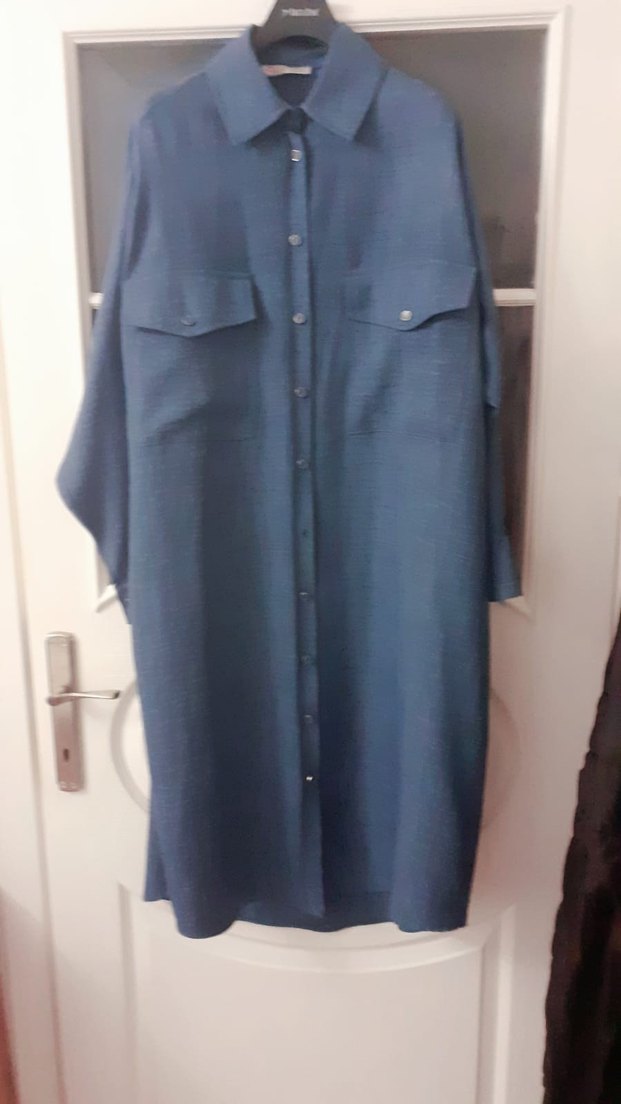 Eiketi üstünde. Lacivert uzun keten kadın gömlek, düğmeli, kısa kollu ve bol kesim.